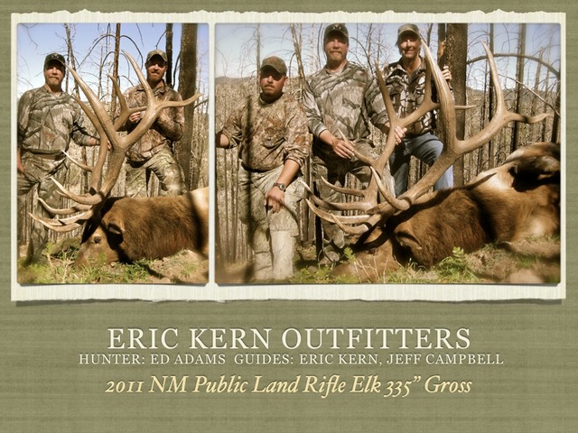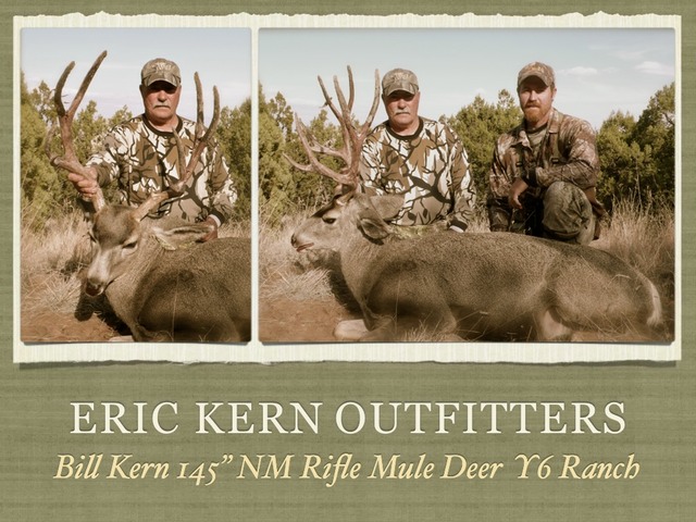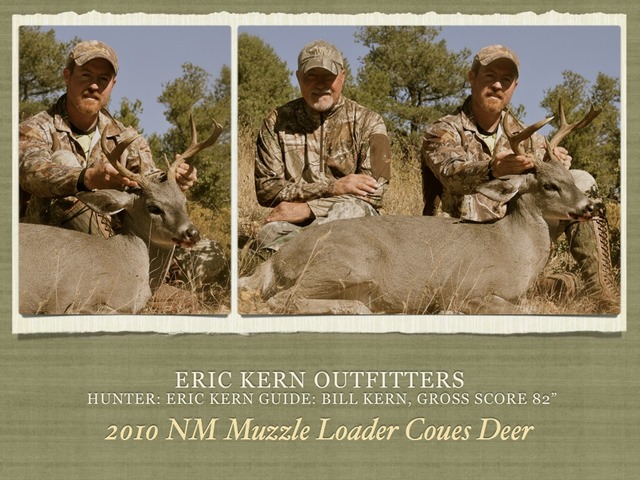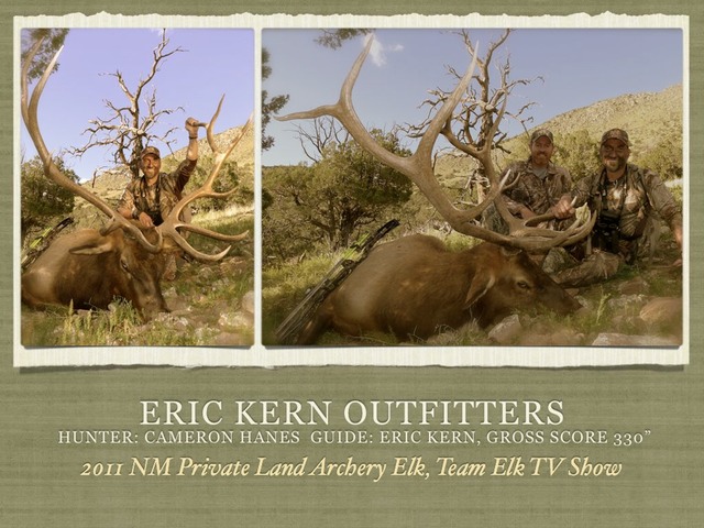 Eric Kern is a professional guide and outfitter located in southwest New Mexico. He hunts, hikes, and lives in this beautiful piece of rugged country year round and specializes in hunting Elk, Mule Deer, Coues Deer, and Antelope. Additional hunts may be arranged for Bighorn Sheep, Javelina, Ibex, Oryx, Turkey, and Varmints. ... Return Document